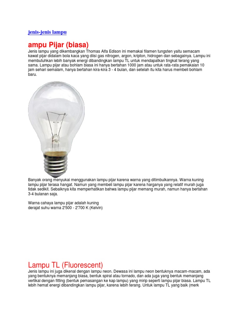 Kelebihan lampu juga ditentukan berdasarkan jenis lampu yang dibuat. Lampu pl, berbeda dengan jenis lampu essential dan tornado yang muncul setelahnya, masih membutuhkan tambahan perangkat yang berisi sirkuit elektronik untuk bekerja (disebut ballast. Sebaliknya jenis lampu ini bisa digunakan untuk ruangan dengan hiasan lampu gantung. Jenis lampu ini sebenarnya merupakan lampu filamen yang sudah berhasil dikembangkan menjadi lebih terang, namun juga kebutuhan energi (watt) yang relatif sama. Penerangan jenis lampu sendiri termasuk ke dalam penerangan buatan. Mengenal jenis jenis lampu perlu anda ketahui agar anda dapat memilih secara tepat sesuai dengan kebutuhan dan kegunaannya. Lampu jenis ini banyak diterapkan pada sepeda motor keluaran lama untuk jenis bebek (cup) dan matik, ya jenis lampu ini banyak di pakai untuk lampu utama pada sepeda motor batangan / sport. Karena cahayanya yang temaram, jenis lampu ini kerap dijadikan alternatif penerangan di kamar. Jenis lampu ini memiliki berbagai macam ukuran yang bisa disesuaikan dengan kebutuhanmu. Fungsi dari lampu led juga sangat beragam, mulai dari lampu led untuk kendaraan. Lampu merupakan sebuah benda yang kini sangat penting bagi. Lampu cfl merupakan pengembangan dari jenis lampu neon dengan ukuran yang lebih kecil. Fungsi lampu led yang beragam seperti untuk kendaraan, senter, dll.