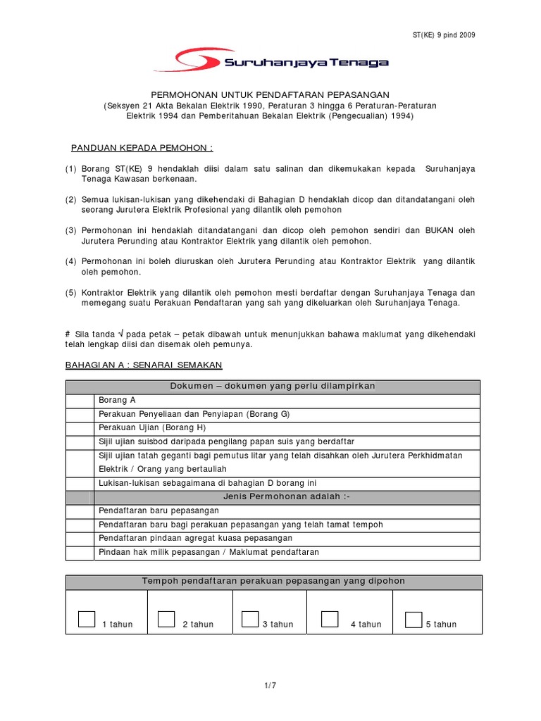 Pemunya atau pengurusan pepasangan setelah menerima notis berkenaan hendaklah membuat persediaan bagi pemeriksaan dibuat dan hadir pada masa pemeriksaan dan ujian itu. Maklumat orang kompeten (diisi bersama borang st(ke)1) v. Walau bagaimanapun, untuk sistem penghantaran atau sistem pengagihan, keupayaan pepasangan itu adalah pada tahap kuasa elektrik yang maksimum, yang sistem itu dijangka atau dikehendaki untuk membekal dalam sesuatu tempoh, mengikut mana satu yang lebih tinggi. Setiap pemeriksaan yang dilaksanakan oleh st akan dikenakan fi bayaran yang perlu dijelaskan oleh pemunya atau pengurusan pepasangan tersebut. Prosedur dan syarat pendaftaran pepasangan elektrik 1.